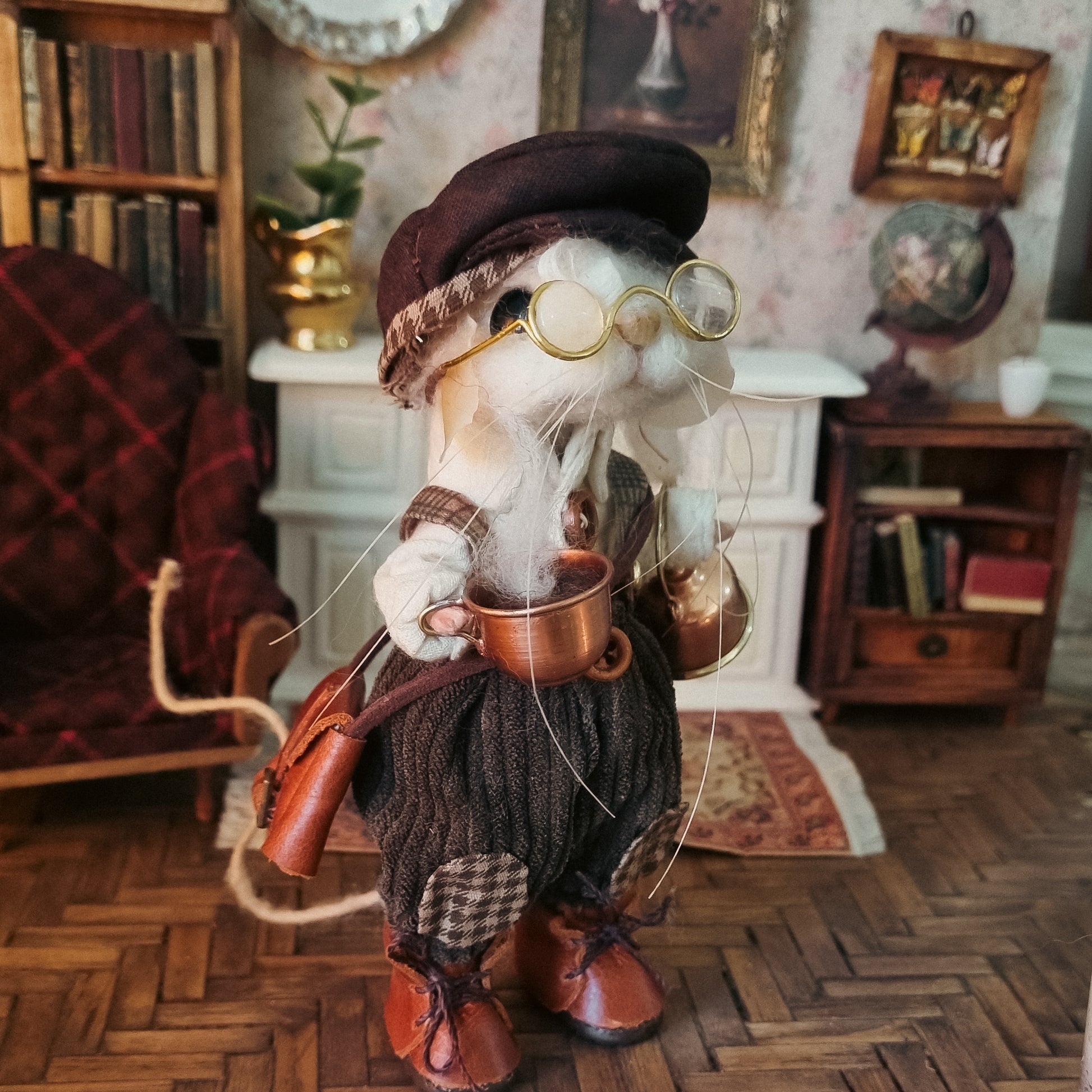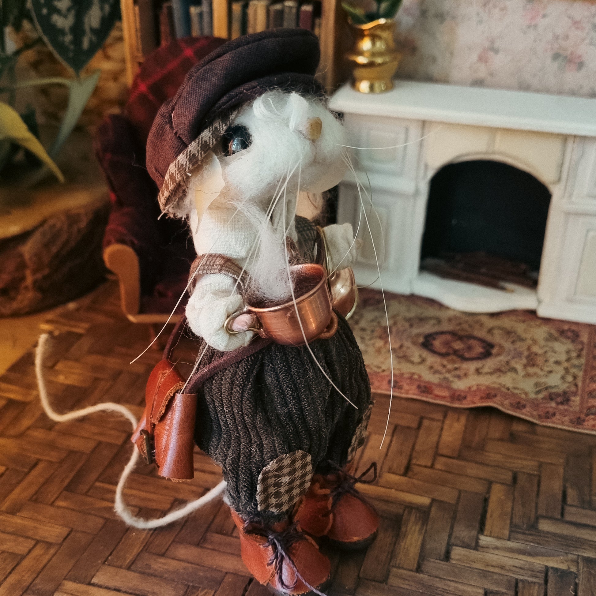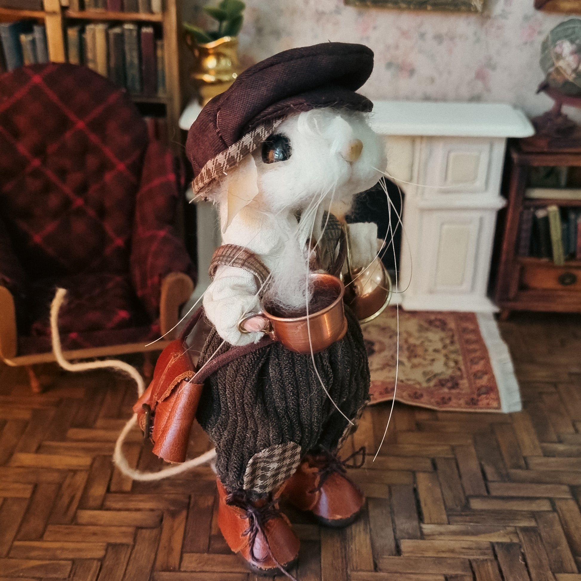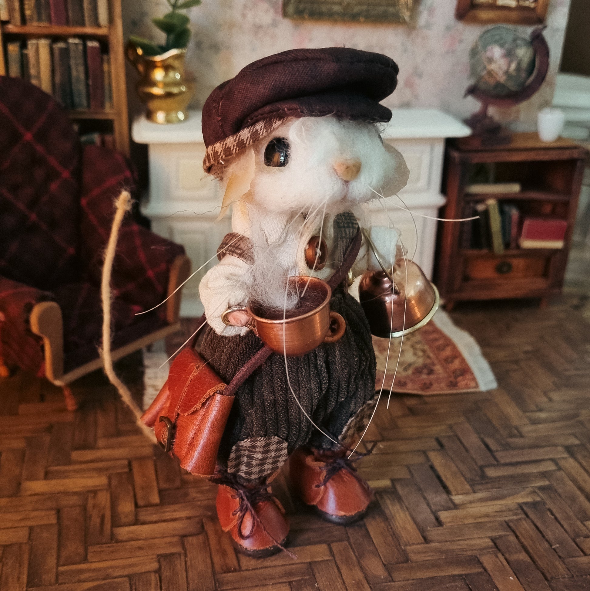 This little mouse wears a corduroy pants and a white shirt, along with a precious dark brown hat. In his overall pocket he carries flowers and a watch. He carries a steaming copper and tin teapot and, and his little leather satchel is filled with trinkets and a good book 🐭🍂🐭