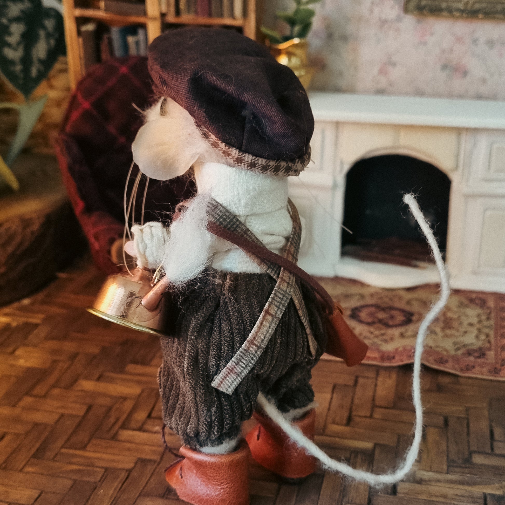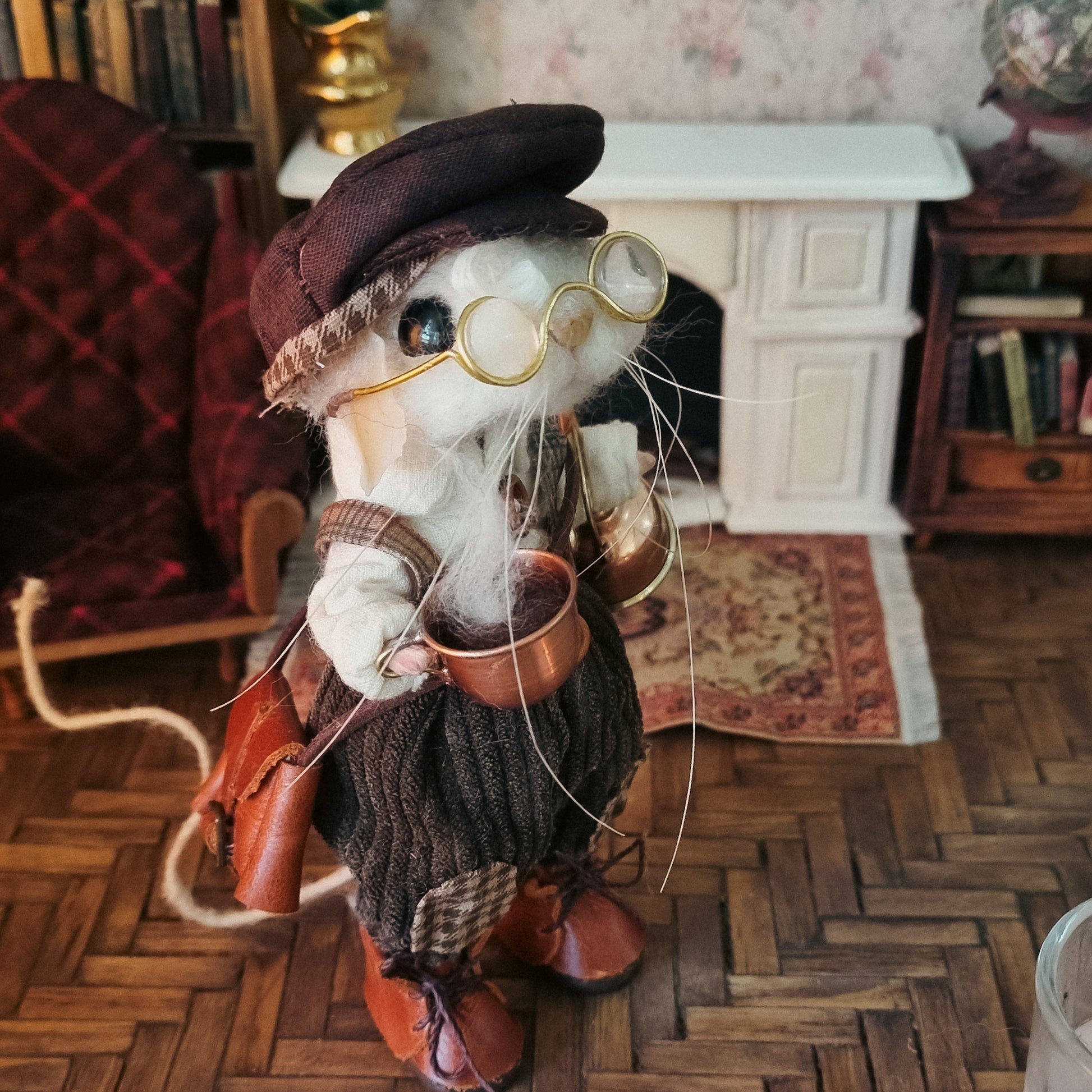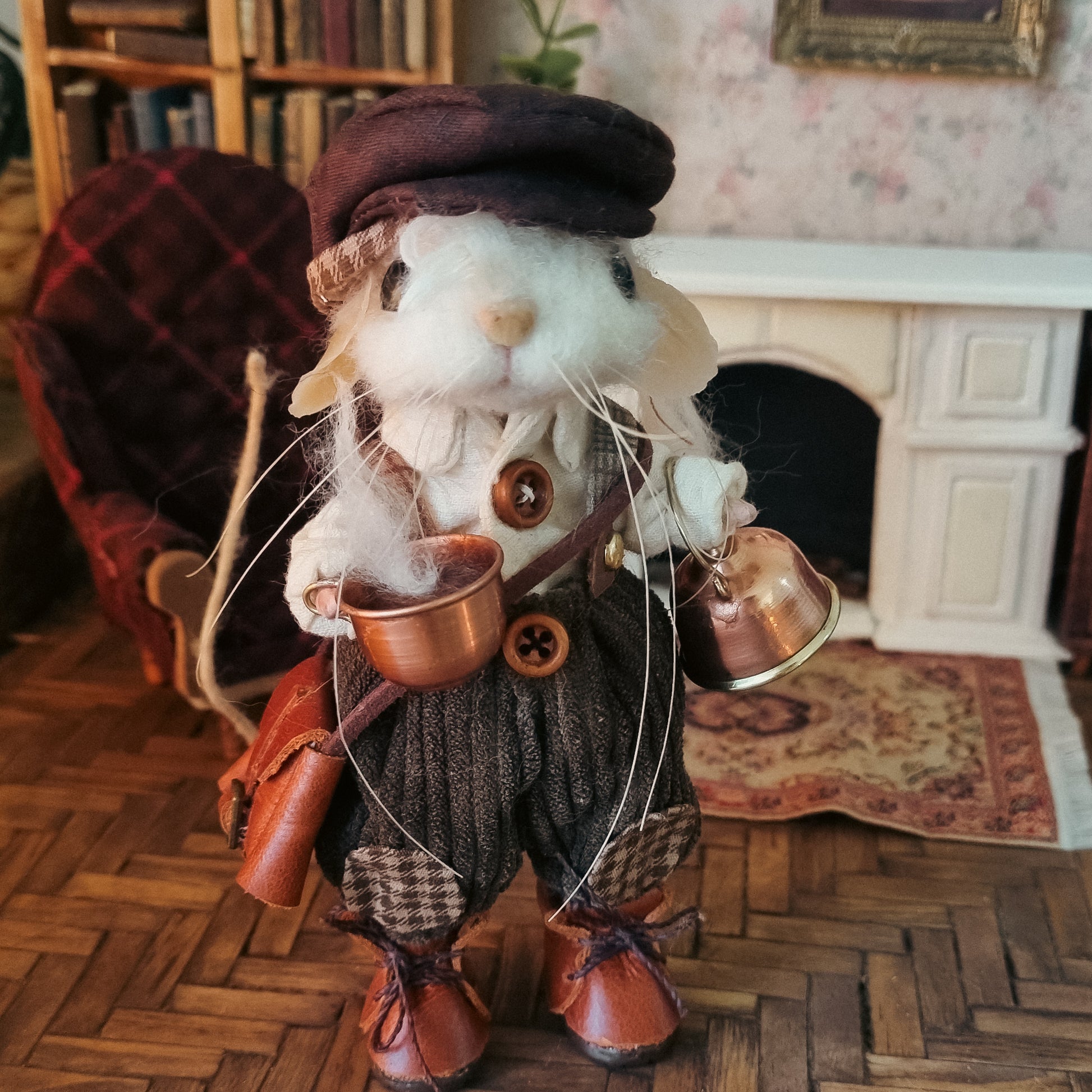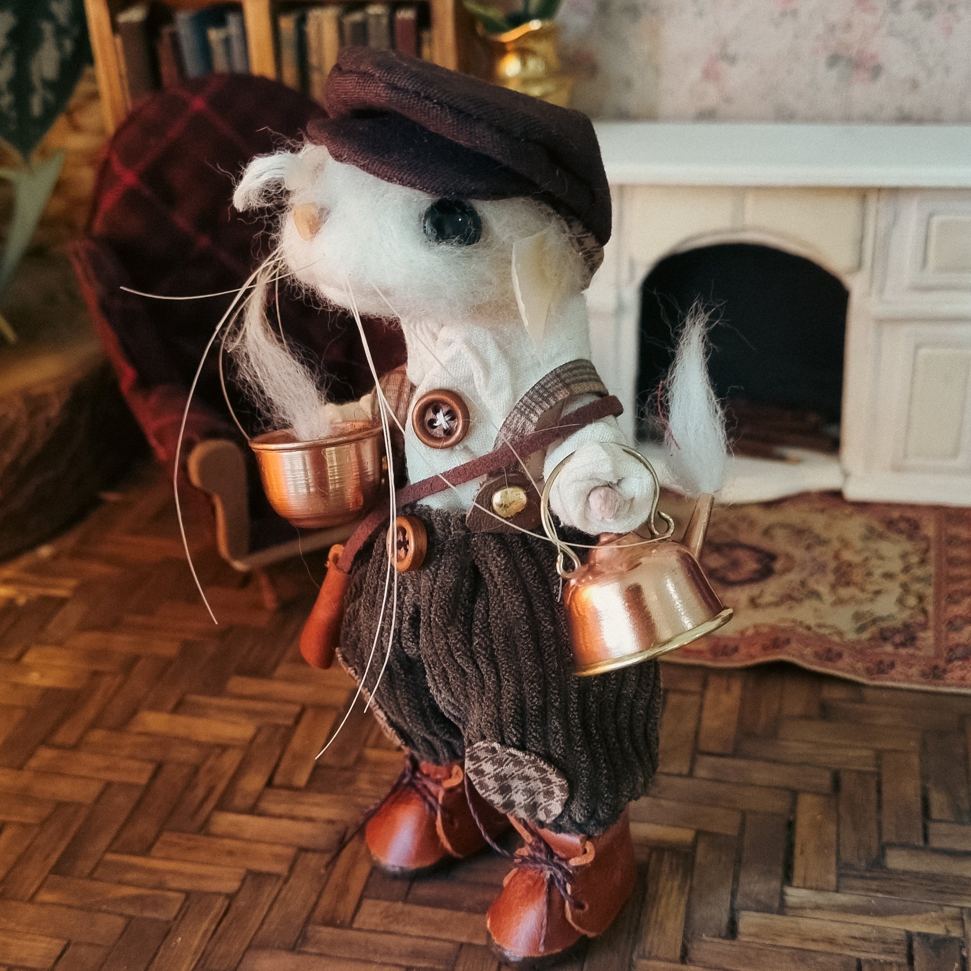 This little mouse wears a corduroy pants and a white shirt, along with a precious dark brown hat. In his overall pocket he carries flowers and a watch. He carries a steaming copper and tin teapot and, and his little leather satchel is filled with trinkets and a good book 🐭🍂🐭