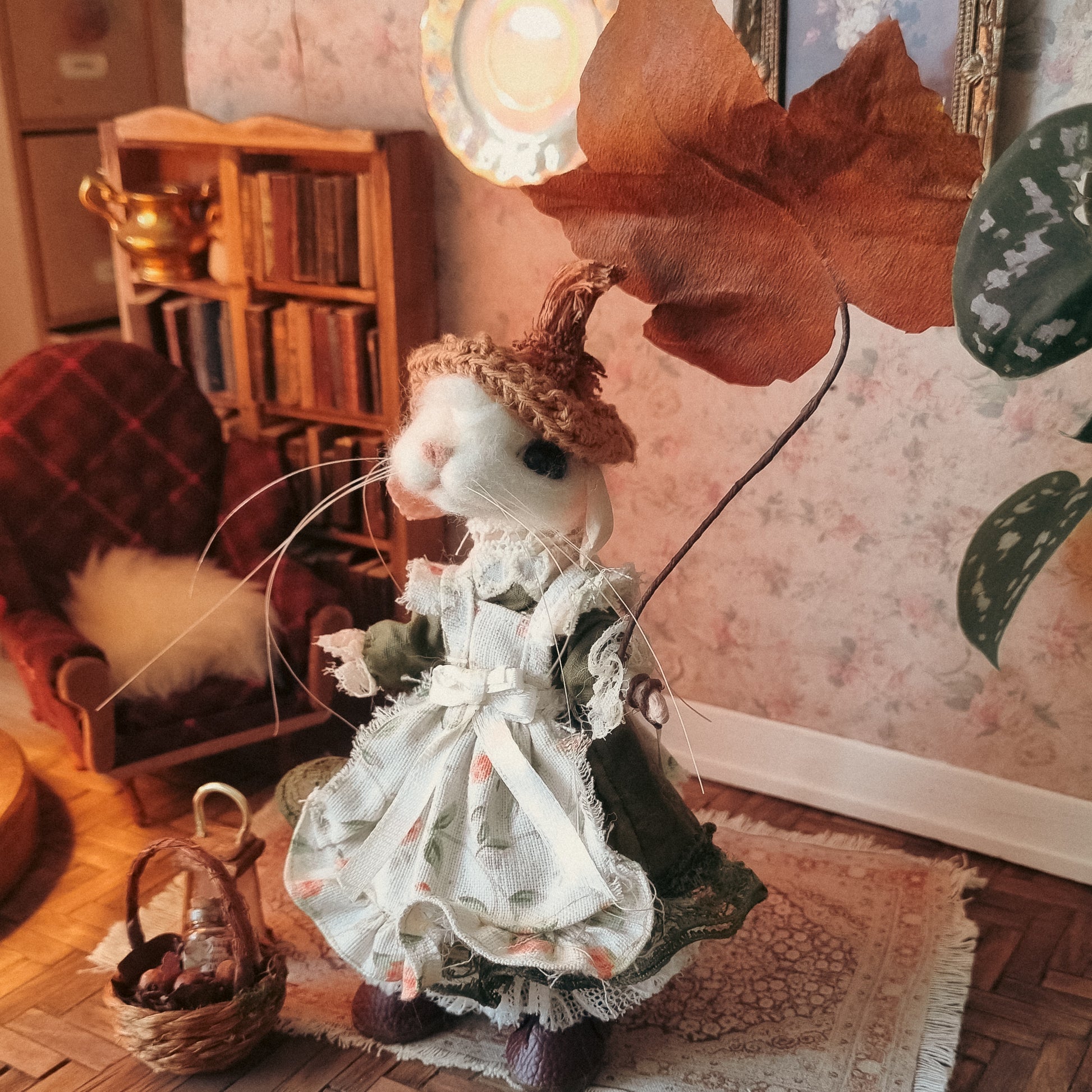 Clover is a delicate little mouse wearing a forest green dress trimmed with ruffled green lace, and an autumn-themed apron with orange flowers. She wears an acorn beret and carries a basket with raspberry jam and freshly picked apples🍎🌰She holds a maple leaf umbrella and a lantern to light her way in the evening of a cozy autumn day 🍁🍂