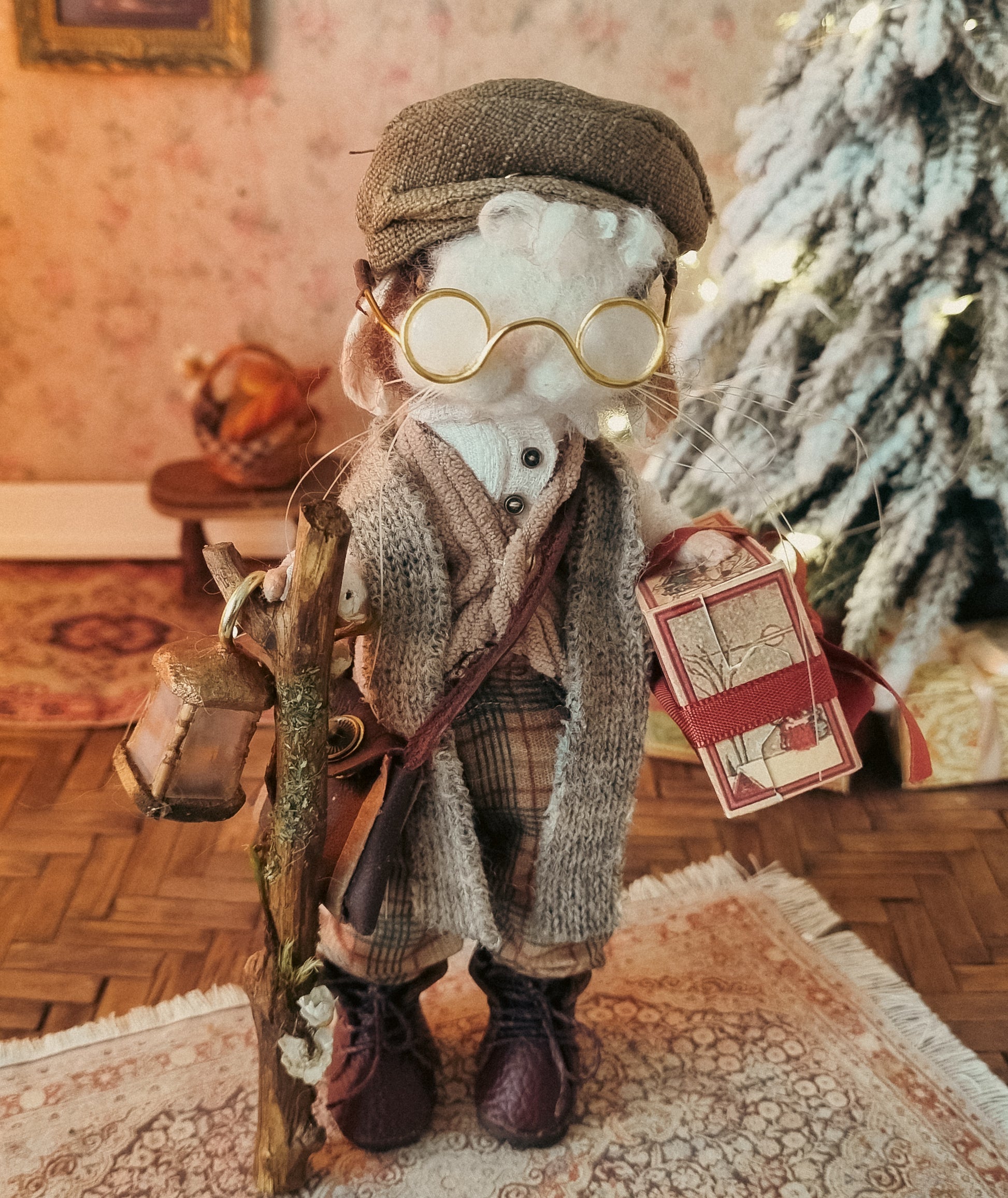 Otto wears a corduroy vest over a white shirt and brown checkered pants, golden glasses, has a little hat, and carries with him a leather satchel, a mossy walking stick and his lantern. He also has a big Christmas gift with him, to put under the tree🐭🎄🍪🎁
