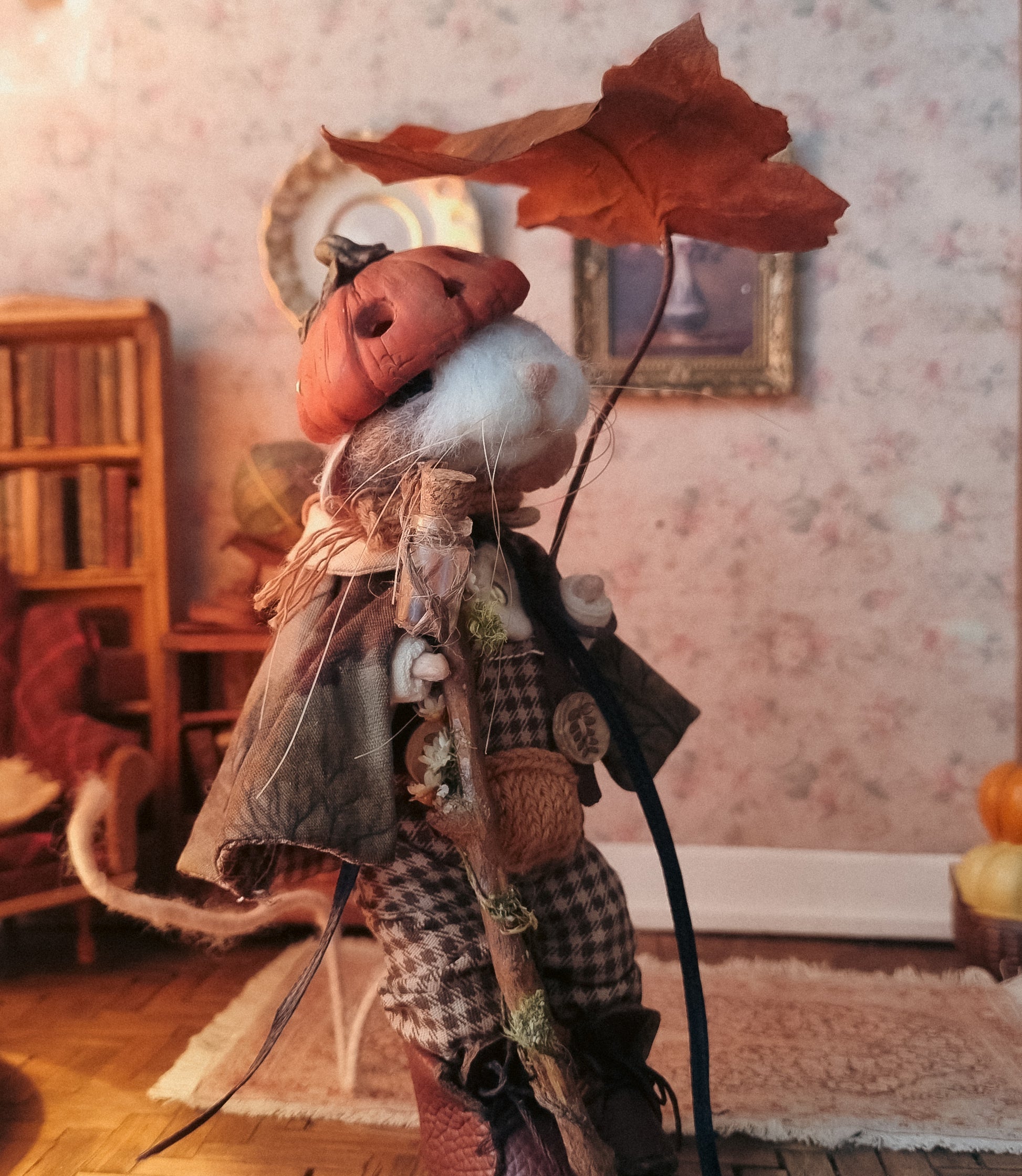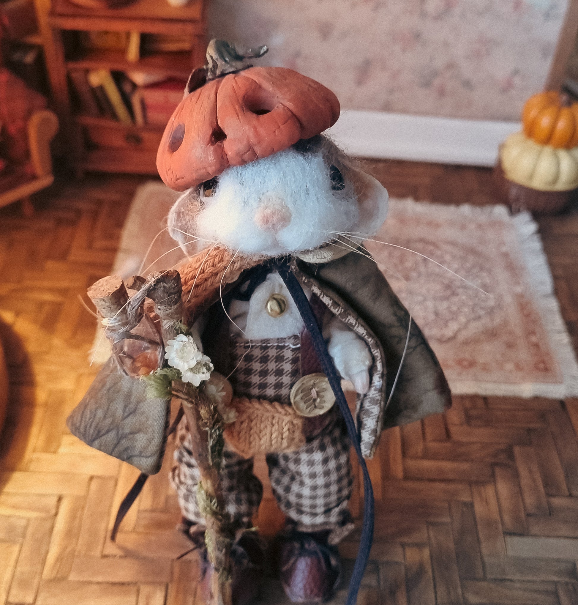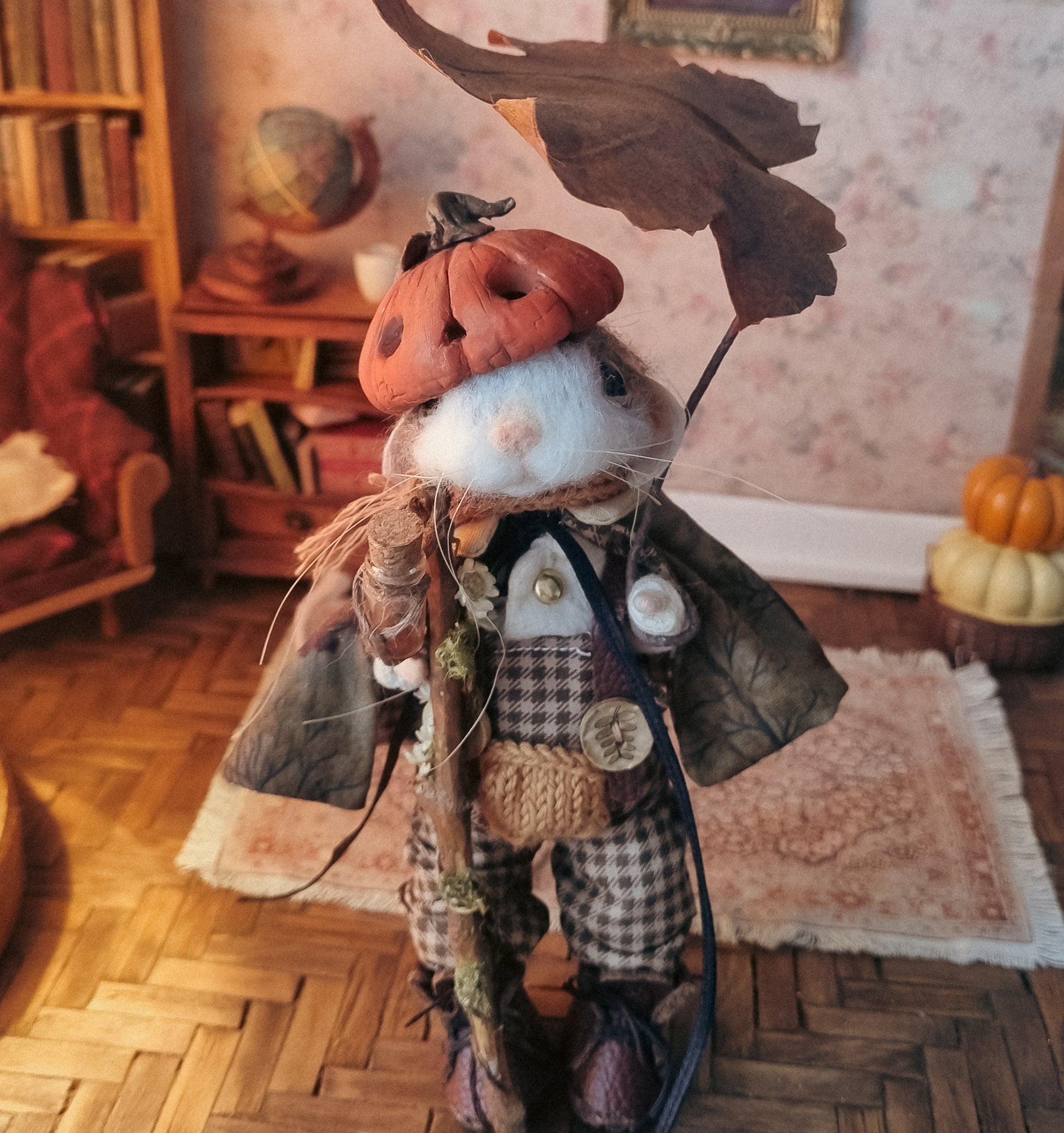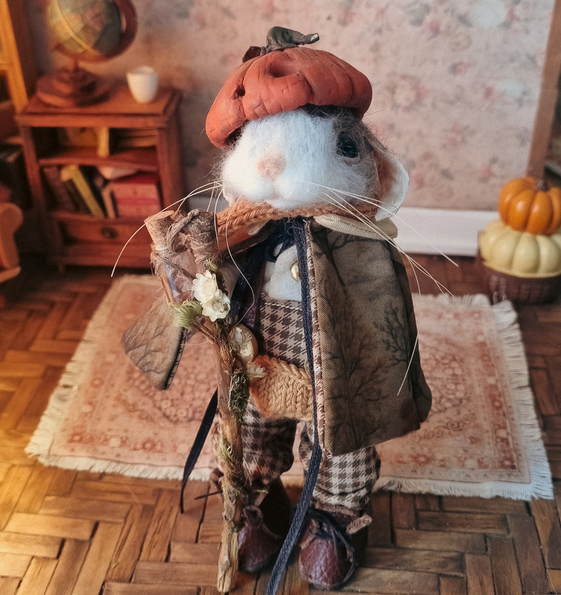 Peregrine is part of the Halloween 2025 collection 🐭 This Hallows' Eve adventurer wears a carved pumpkin hat, and an autumn coat full of the trees. He wears a checkered overalls over a white shirt, and carries both a mossy walking stick and a leaf umbrella 🎃🍂🍁🕯️