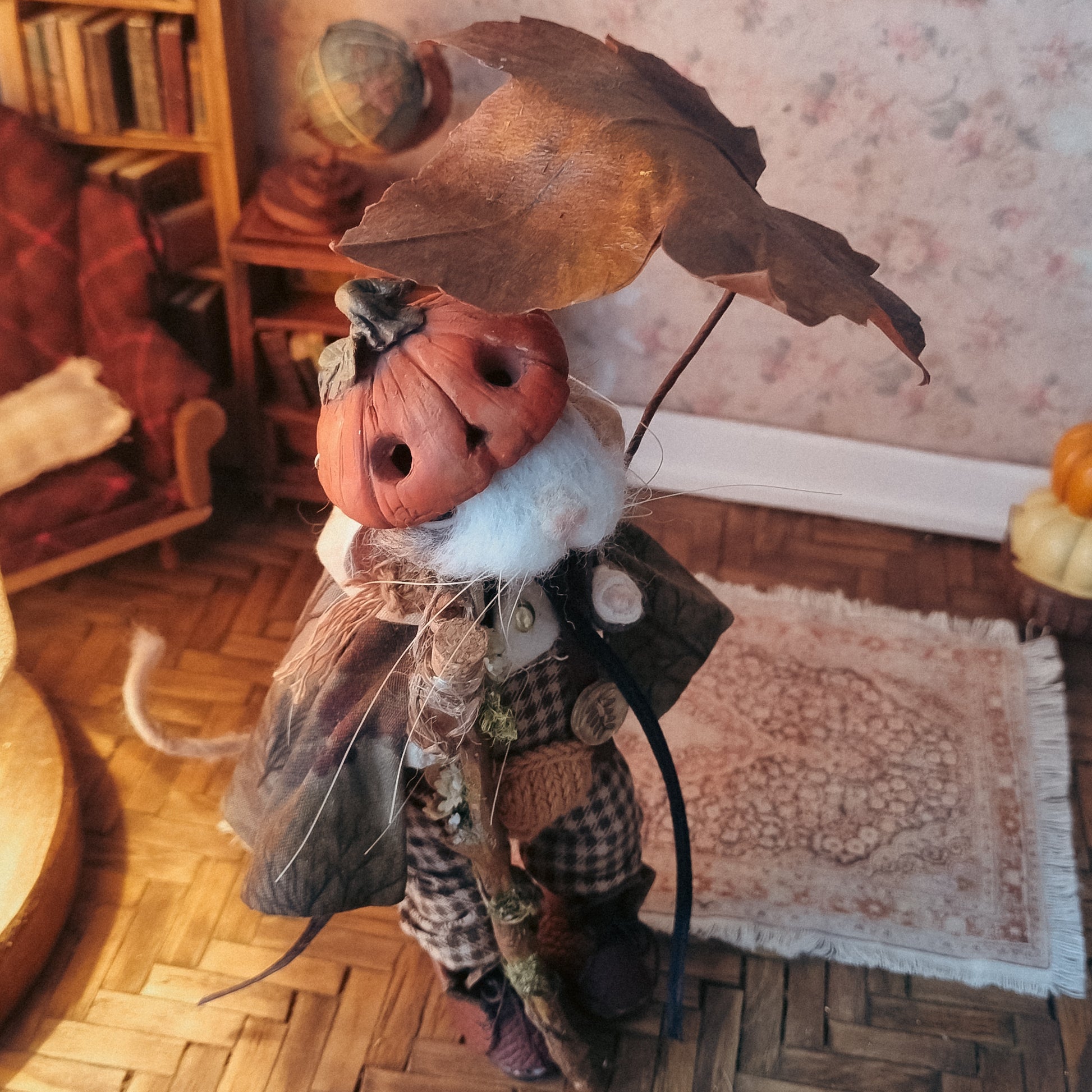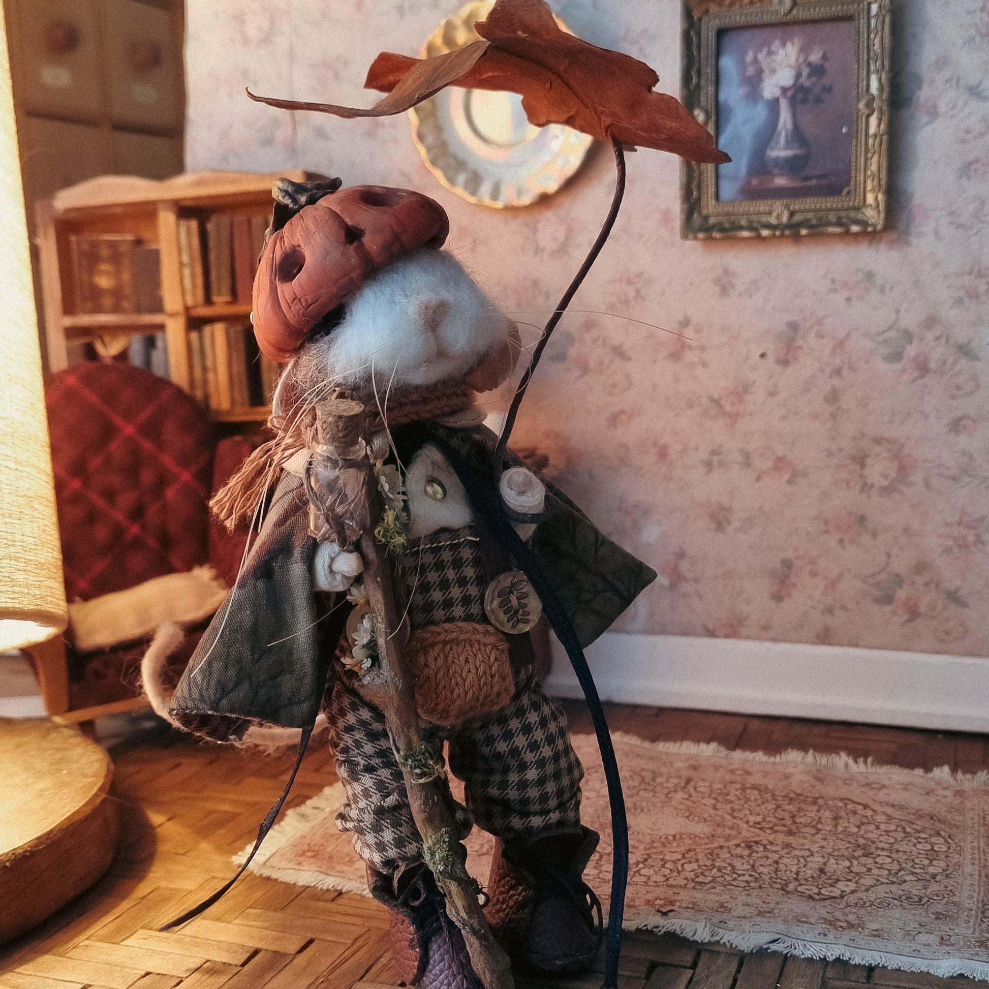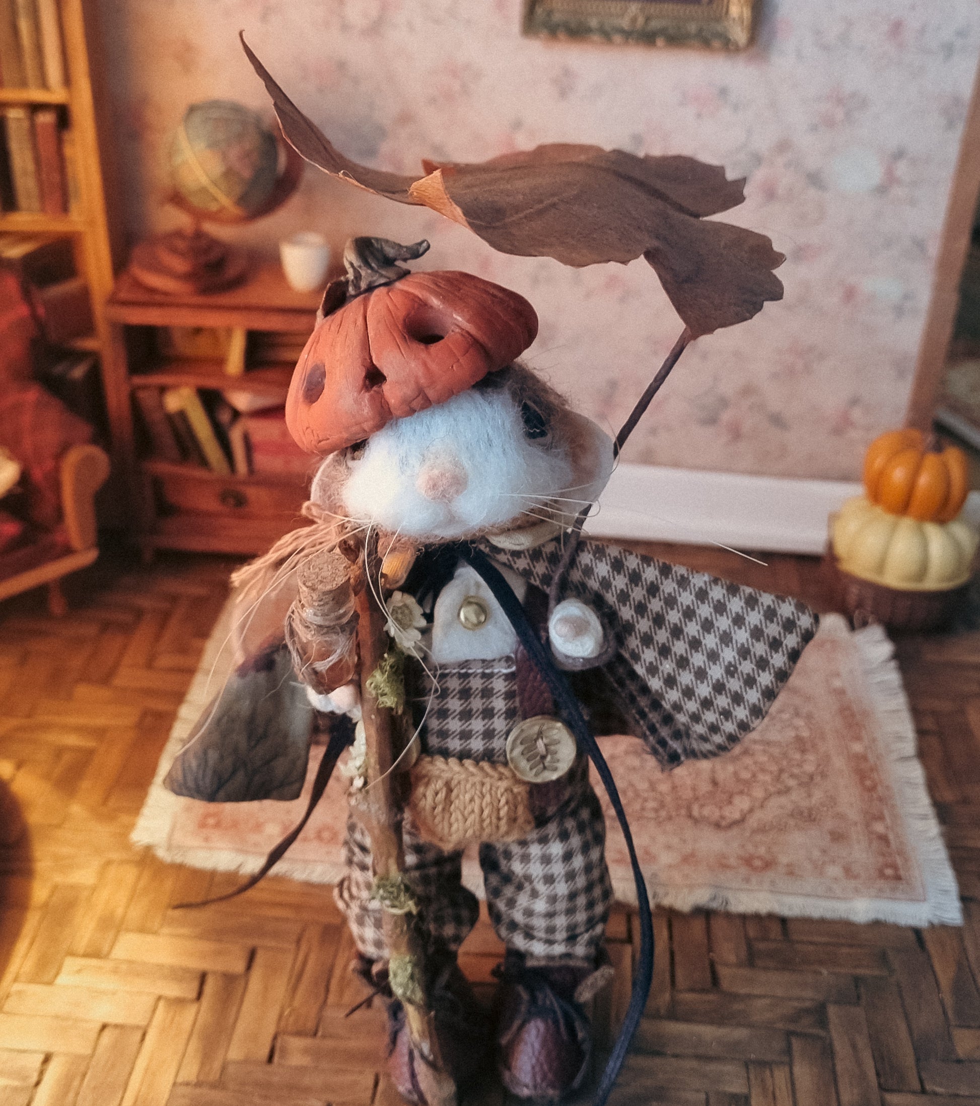 Peregrine is part of the Halloween 2025 collection 🐭 This Hallows' Eve adventurer wears a carved pumpkin hat, and an autumn coat full of the trees. He wears a checkered overalls over a white shirt, and carries both a mossy walking stick and a leaf umbrella 🎃🍂🍁🕯️