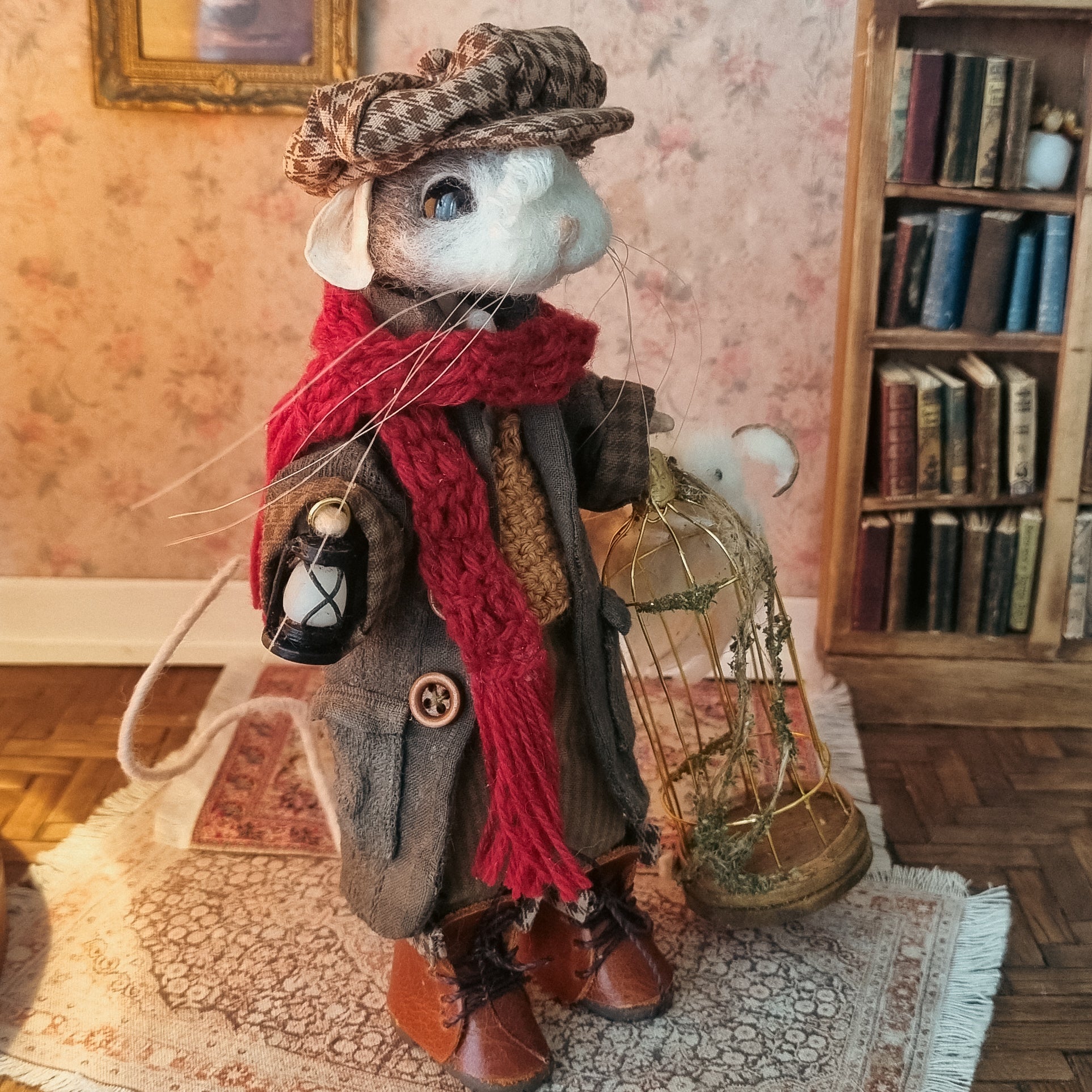William is warm and cozy in his oversized coat, baker's hat and red scarf, wearing a vest and a shirt, pus some striped pants. He is taking care of Pearl, a mori moth with quite sophisticated tastes, and carrying her mossy little transport golden cage. He also has a little lantern to help him on his way. William is based on the main character of the book I'm writing, and Pearls is in it too! ⋆꙳❅*‧ ‧*❆ ₊⋆
